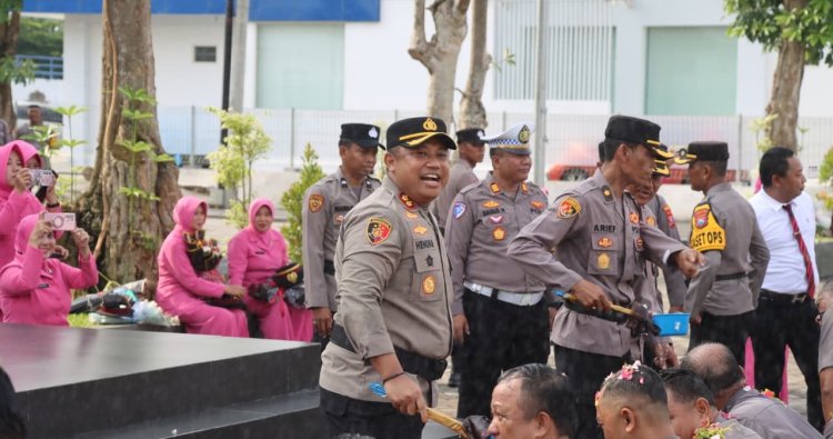 Usai Upacara Korps Raport dilanjutkan dengan menyiramkan air kembang kepada perwakilan personel yang naik pangkat oleh Kapolres Pamekasan didampingi para PJU Polres Pamekasan.