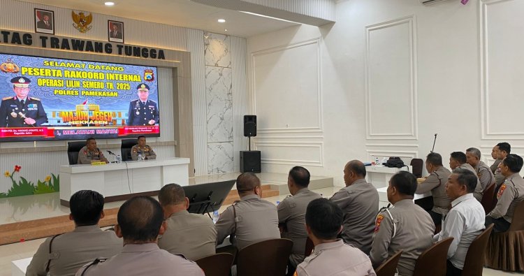 PAMEKASAN - Polres Pamekasan menggelar rapat koordinasi (rakor) internal dalam rangka kesiapan pelaksanaan Operasi Lilin Semeru 2025 untuk pengamanan Natal 2025 dan Tahun Baru 2026 di Gedung Tatag Trawang Tungga, Selasa (16/12/2025).